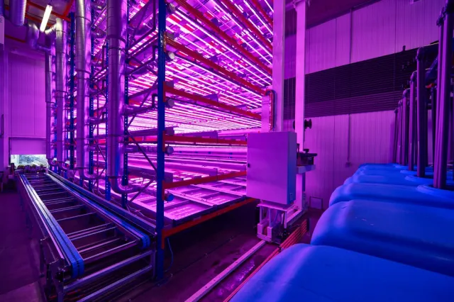 De lokale, hyper-efficiënte plantenfabriekFoto: Urban Crop SolutionsUrban Crop Solutions bouwt volledig geautomatiseerde indoor farming systemen met LED verlichting.